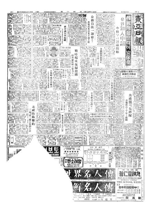 - 公務員法一讀會完了(공무원법일두회완요) 農地改革法案不遠上程(농지개혁법안부원상정)