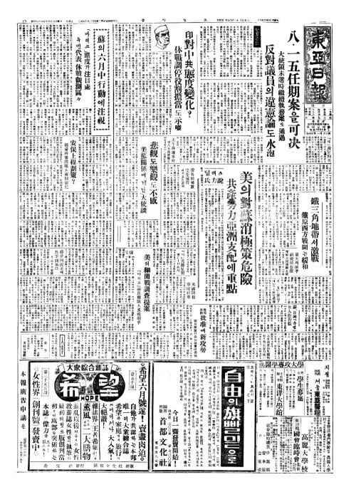 - 美(미)의對蘇消極策危險(대소소극책위험) 共產勢力亞洲支配(공산세력아주지배)에重點(중점)