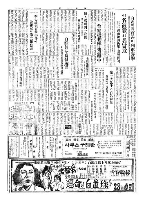 - 白晝(백주)에四百(사백)공비列車襲擊(열차습격) 46名被(명피)?、80名(명)납致(치)
