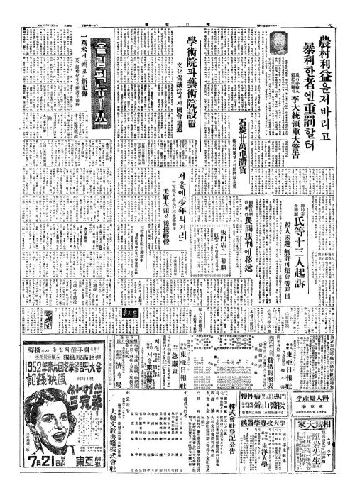- 學術院(학술원)과藝術院設置(예술원설치) 文化保議法(문화보의법)어제國會通過(국회통과)