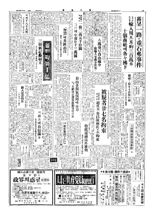 - 被疑者廿七名拘束(피의자입칠명구속) 國際俱樂部事件(국제구악부사건) 趙炳玉(조병옥)、金昌淑兩氏(김창숙양씨)는不拘束(부구속)
