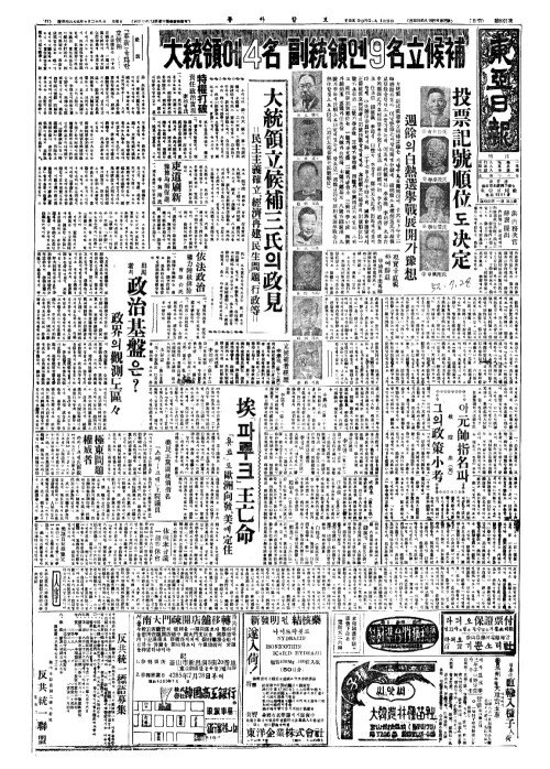 - 大統領立候補三氏(대통영립후보삼씨)의政見(정현) =民主主義確立經濟再建民生問題(민주주의확립경제재건민생문제)、行政等(항정등)=