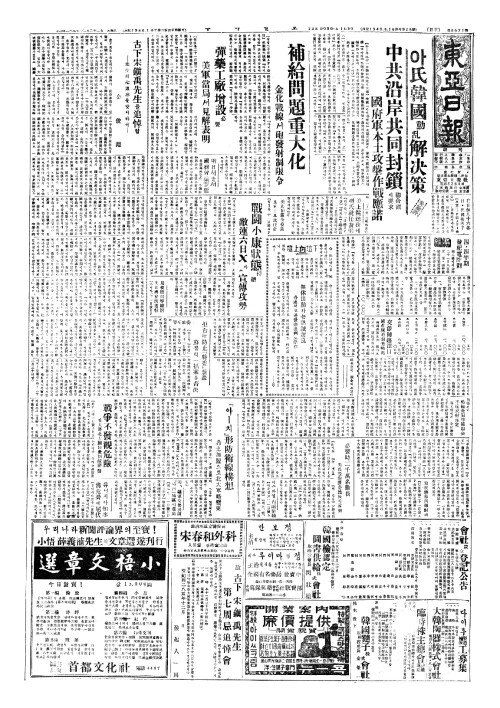 - 아氏韓國動乱解决策(씨한국동난해결책) 美論評(미론평) 中共沿岸共同封鎻(중공연안공동봉쇄) 聯合國(련합국)에要求(요구)