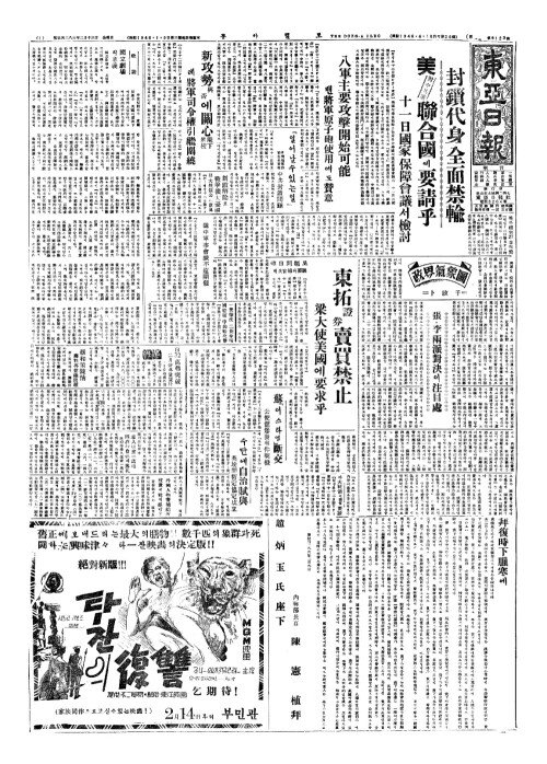 - 封鎻代身全面禁輸(봉쇄대신전면금수) 美對中共策聯合國(미대중공책련합국)에要請乎(요청호)