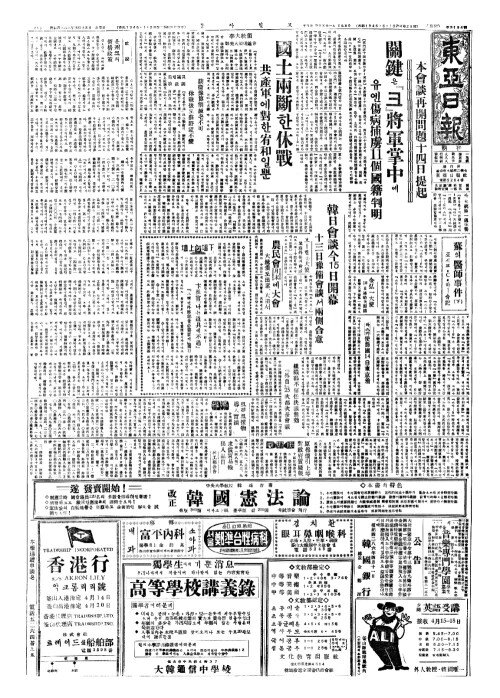 - 本會談再開問題十四日提起(본회담재개문제십사일제기) 關鍵(관건)은『크』將軍掌中(장군장중)에