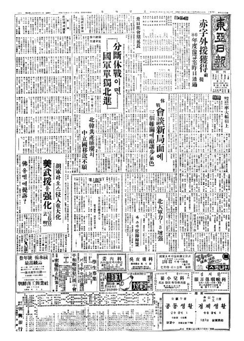 - 休戰(휴전) 會談新局面(회담신국면)에 三個難關(삼개난관)에敵讓步氣色(적양보기색)