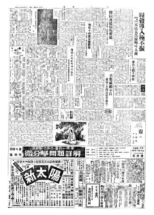 - 糧糓導入極不振(량곡도입극부진) 四月末現在不過五萬餘噸(사월말현재부과오만여톤)이入荷(입하)