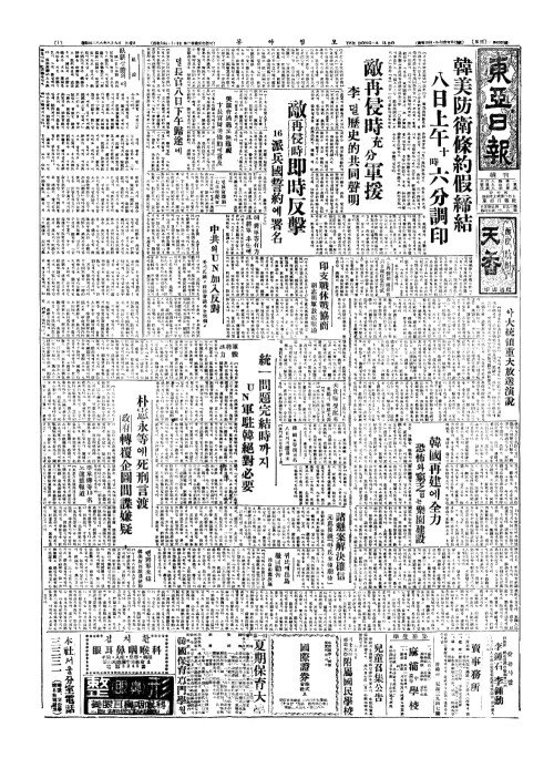 - 韓美防衛條約假締結(한미방위조약가체결) 八日上午十時六分調印(팔일상오십시륙분조인)