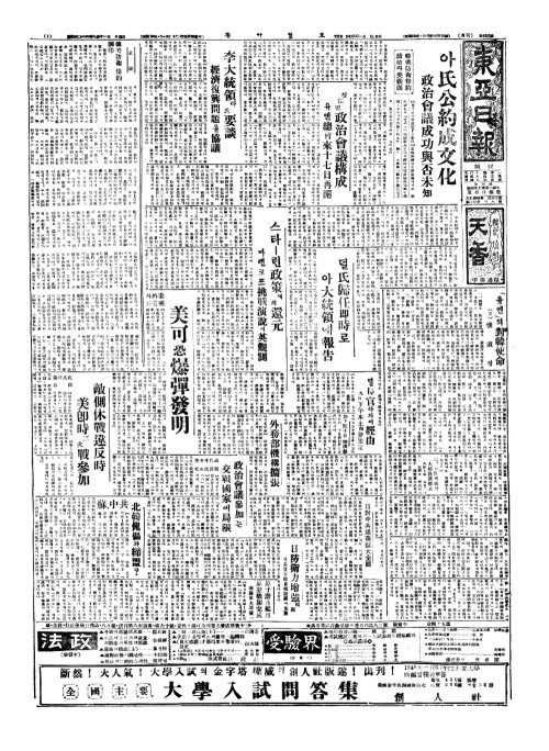 - 첫議題(의제) 政治會議構成(정치회의구성) 유엔總會來十七日再開(총회내십칠일재개)