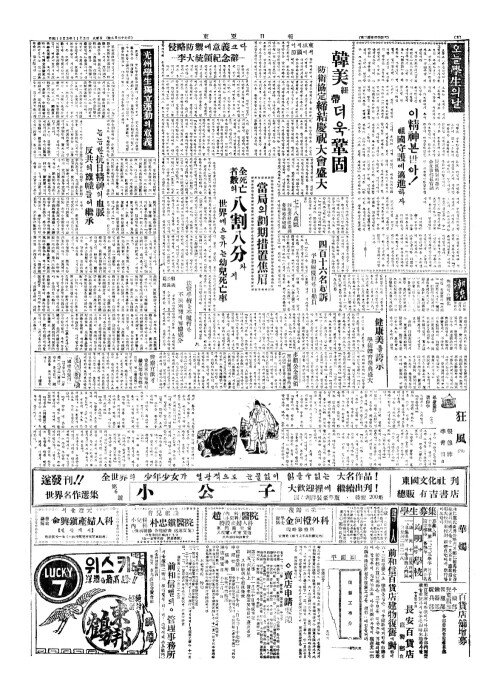 - 來廿二日(내입이일)에 全黨大會開催(전당대회개최) 民主國民黨(민주국민당)