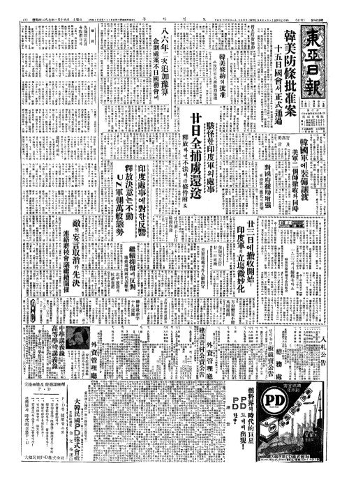 - 韓美防條批准案(한미방조비준안) 十五日國會(십오일국회)서正式通過(정식통과)
