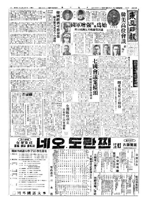 - 韓(한) 國(국)、美(미)、英(영)、佛(불)、蘇(소)、北韓傀儡(북한괴뇌)、中(중) 共(공) 七國會議案擡頭(칠국회의안대두) 四相會議舞臺裏面(사상회의무대이면) 에서韓國問題解決模索(한국문제해결모색)