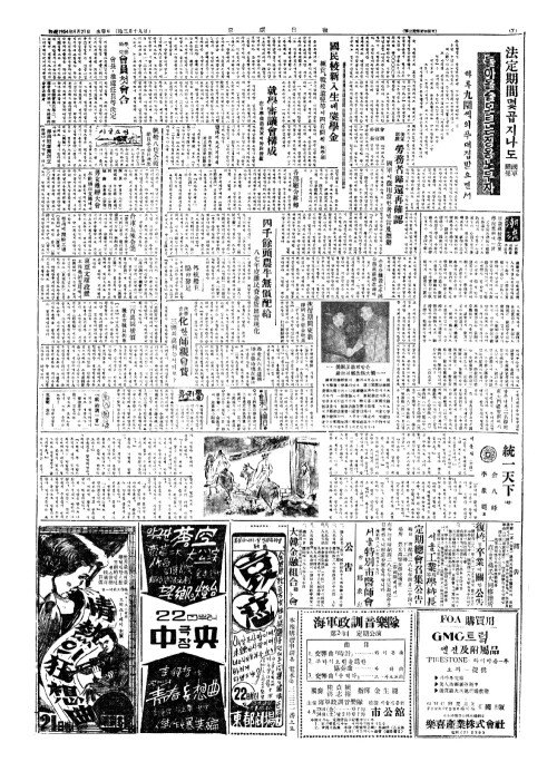 - 國民校新入生(국민교신입생)에獎學金(장학김) 極貧(극빈)、戰歿遺兒等(전몰유아등)에四百圜(사백원)씩 每學期(매학기)
