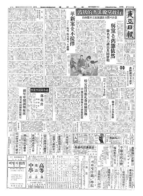- 革新案(혁신안)을不採擇(부채택) 20日下午(일하오)의 自由黨大會(자유당대회) 院外(원외)·院內間(원내간)에큰波瀾(파난)