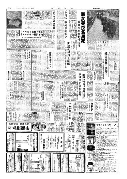 - 海女等(해녀등)23名溺死(명닉사) 暴風(폭풍)으로漁船(어선)이沈沒(심몰)
