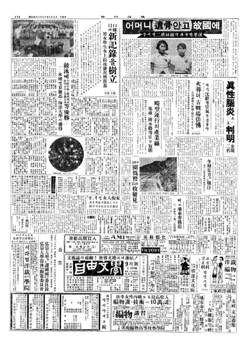 - 14種目(종목)에 新記錄(신기록)을樹立(수립) 男女學生水上競技盛況裡閉幕(남녀학생수상경기성황리폐막) 本社主催(본사주최)