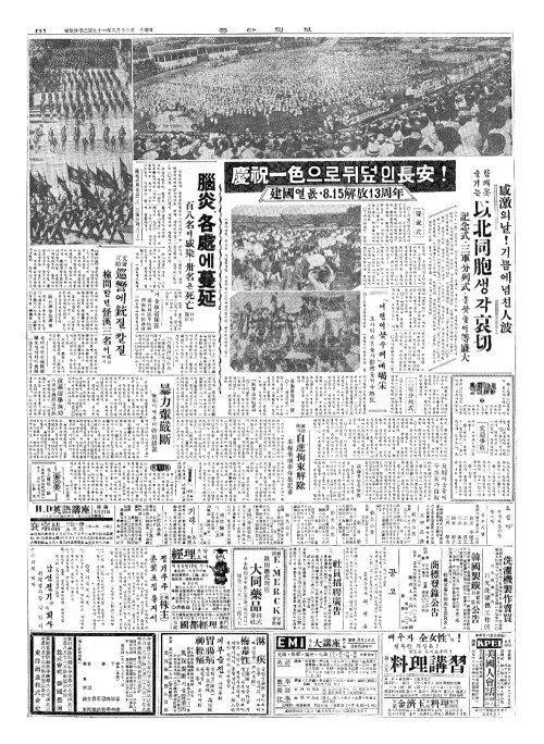 - 慶祝一色(경축일색)으로뒤덮인長安(장안)!建國(건국)열돐·8.15解放(해방)13周年(주년)