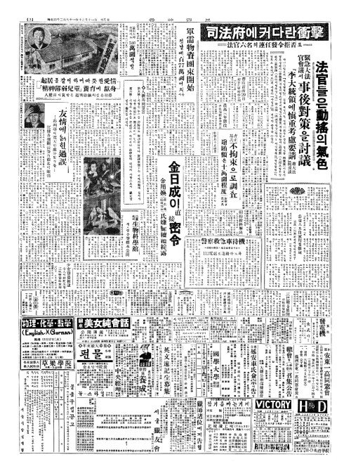 - 法官六名連任拒否(법관륙명연임거부) 10日二次(일이차)로八名(팔명)만發令(발령)