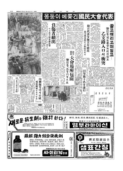 - 데모企圖挫折(기도좌절) 淸州(청주)서도民主黨員十九名(민주당원십구명)을連行(련행)