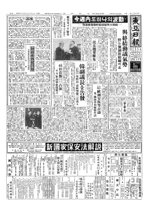 - 國會十日流會(국회십일류회) 與黨側(여당측)서不出席(부출석)