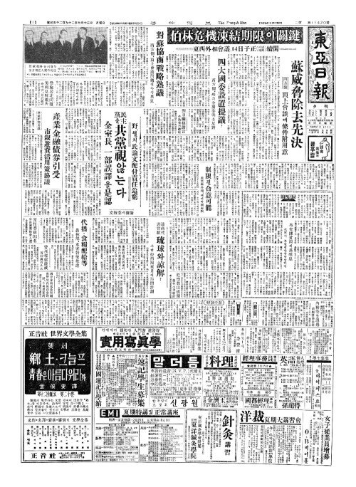 - 伯林危機凍結期限(백림위기동결기한)이關鍵(관건) 東西外相會議(동서외상회의)、14日子正(일자정)(韓國時間(한국시간))續開(속개)