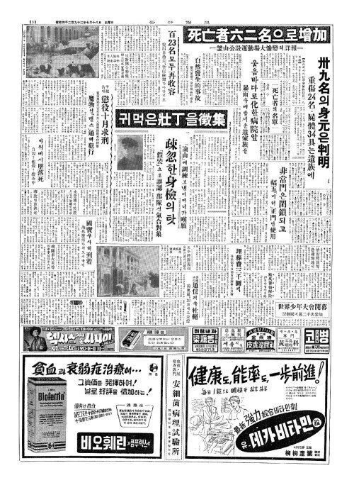 - 死亡者六二名(사망자륙이명)으로增加(증가) 釜山公設運動場大慘變(부산공설운동장대참변)의詳報(상보)