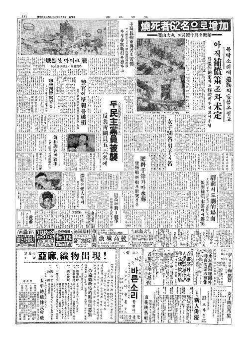 - 燒死者(소사자)62名(명)으로增加(증가) 釜山大火(부산대화) 또屍體十具(시체십구)를發掘(발굴)