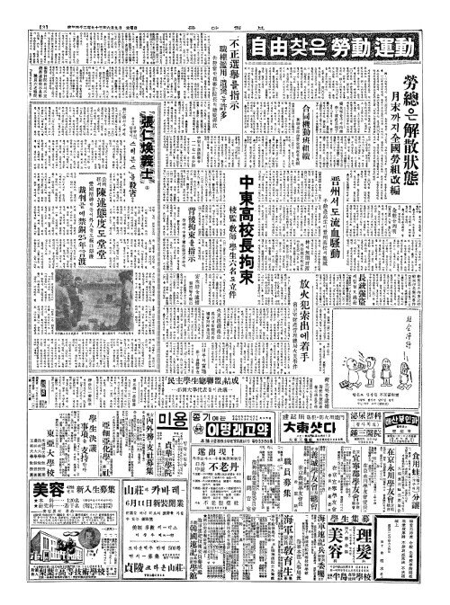 - "不法行爲(부법행위) 斷乎依法處斷(단호의법처단) 許首席談(허수석담) 學園(학원)·勞組紛糾(로조분규)는總選威脅(총선위협)"