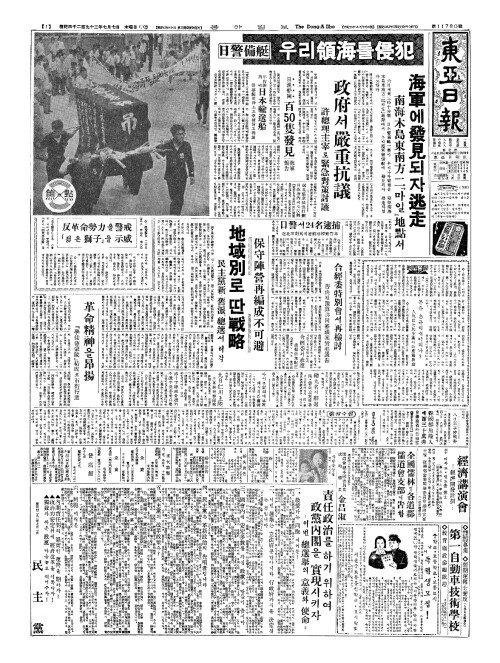 - 韓國側抗議(한국측항의)에 日本(일본)선無誠意(무성의) 領海三哩再主張(영해삼리재주장)