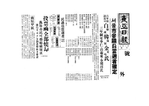- 七月三十一日字(칠월삼십일일자)로民議員選擧特輯四面(민의원선거특집사면)을發行(발행)