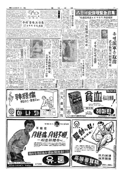 - 八日(팔일)에『安保理(안보리)』緊急召集(긴급소집) 유엔派軍(파군)은取消(취소)