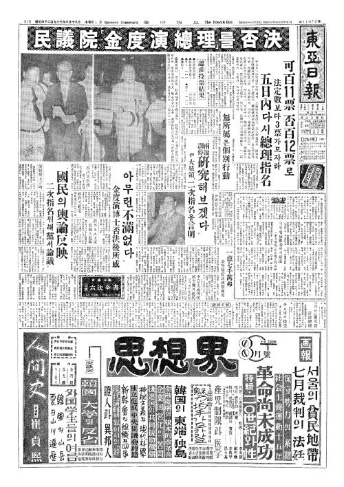 - 民議院(민의원)「金度演總理(김도연총리)」를否決(부결)