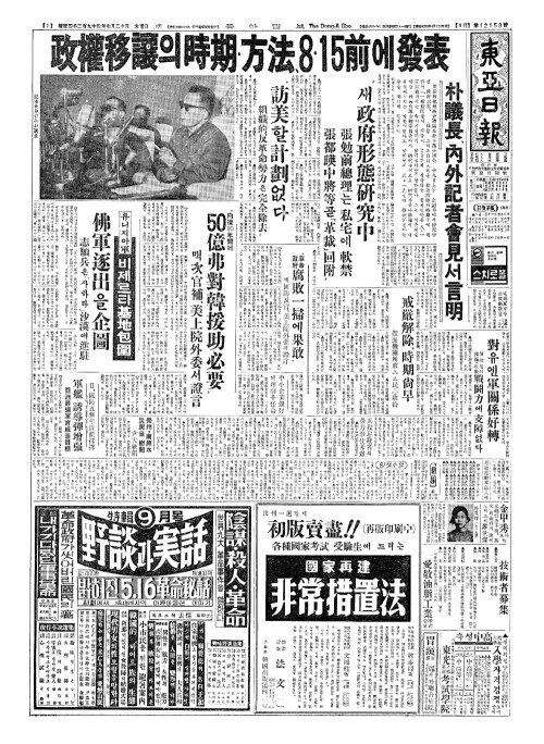 - "革命政府腐敗一掃(혁명정부부패일소)에果敢(과감)" 맥國防長官(국방장관)、美上院外委(미상원외위)서證言(증언)