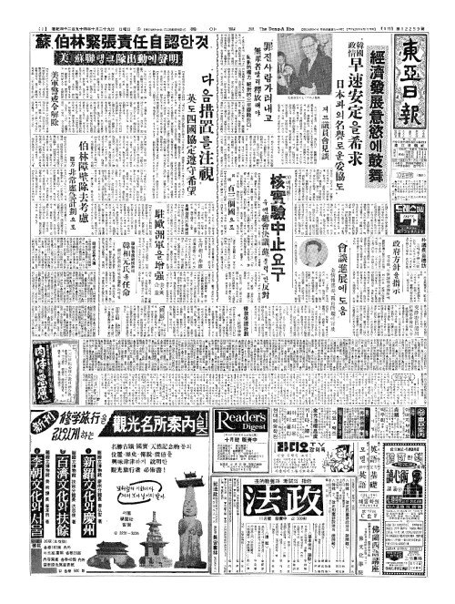 - "蘇(소)、伯林緊張責任自認(백림긴장책임자인)한것"美(미)、蘇聯(소련)탱크隊出動(대출동)에 聲明(성명)