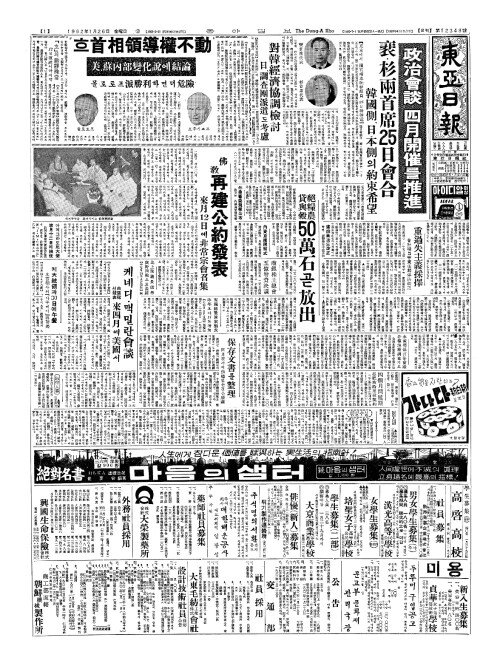 - 政治會談(정치회담) 四月開催(사월개최)를推進(추진) 裵(배)·杉兩首席(삼양수석)25日會合(일회합)