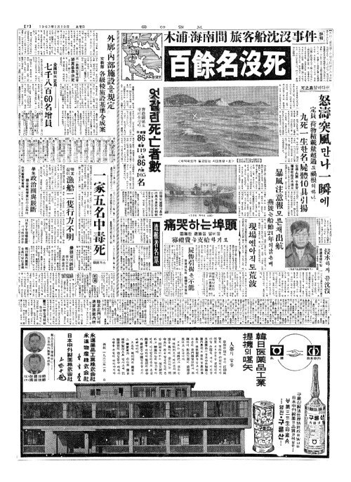 - 木浦(목포)·海南間(해남간) 旅客船沈沒事件(여객선침몰사건) 詳報(상보) 百餘名沒死(백여명몰사)