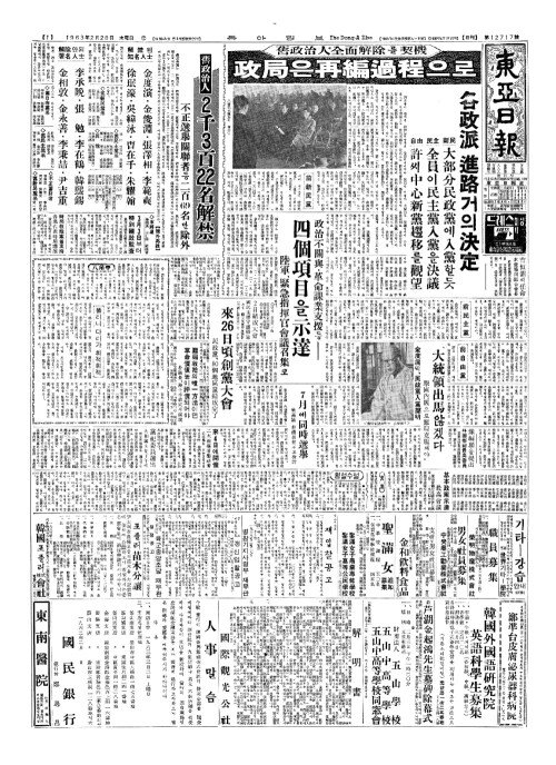 - 舊政治人全面解除(구정치인전면해제)를契機(계기) 政局(정국)은再編過程(재편과정)으로