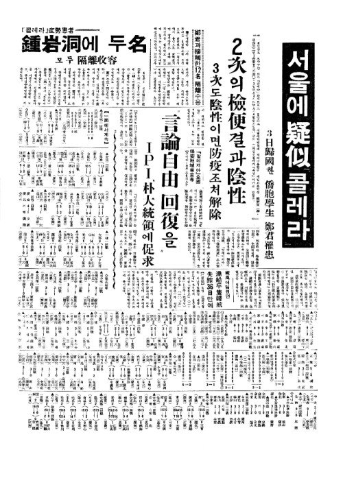 『콜레라』症勢患者(증세환자)=鍾岩洞(종암동)에 두名(명)