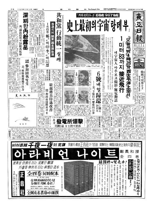 - 「제미니」6號(호)와7號(호) 史上最初(사상최초)의 宇宙(우주)『랑데부』