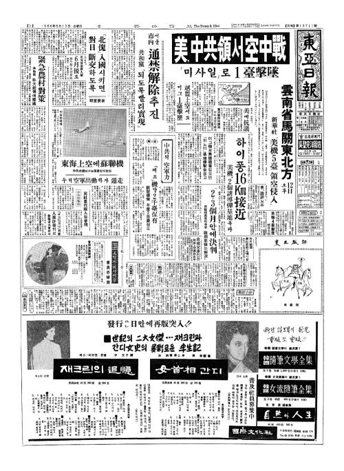 - 美(미),中共領(중공영)서空中戰(공중전)『미사일』로 1臺擊墜(대격추)
