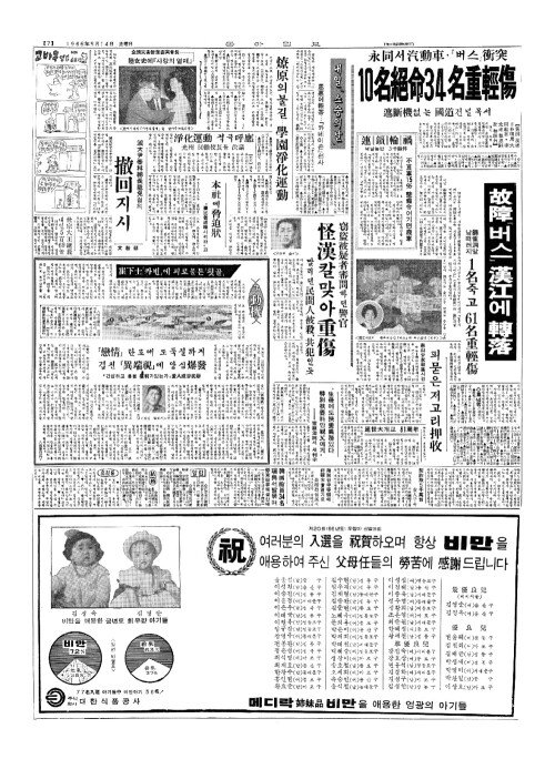 - 永同(영동)서汽動車(기동차)·『버스』衝突(충돌) 10名絶命(명절명)34名重輕傷(명중경상)