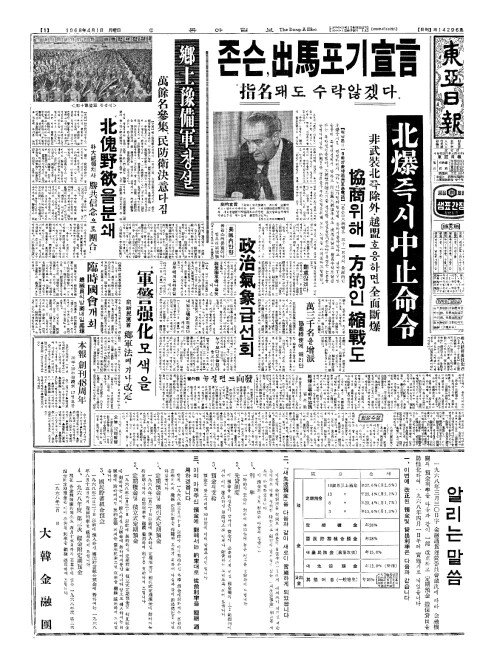 - "軍警强化(군경강화)모색을 俞新民黨首(수신민당수) 鄕軍法(향군법)폐기나改定(개정)"