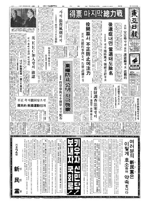 - 金黨首代行(김당수대항)방송 新民過半數(신민과반삭)호소 "改憲線(개헌선)목표로不正(부정)
