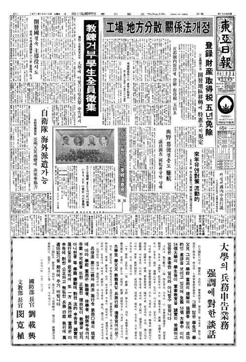 - 國防(국방)·文教長官(문교장관)담화"教鍊(교련)거부學生全員徵集(학생전원징집)"