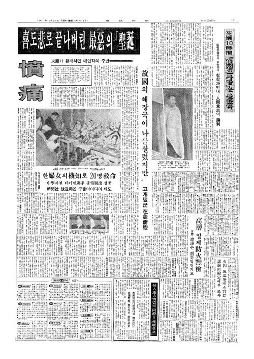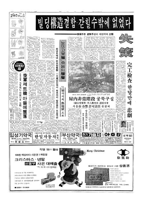- 빌딩構造(구조)결함…갇힐수밖에 없었다喜(희)도悲(비)로끝나버린最惡(최악)의「聖誕(성탄)」—慘禍(참화)부른 虛㸃(허점)투성이 대연각의 正體火魔(정체화마)가 활개치던 대연각의 주변——失策憤痛(실책분통)