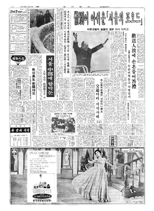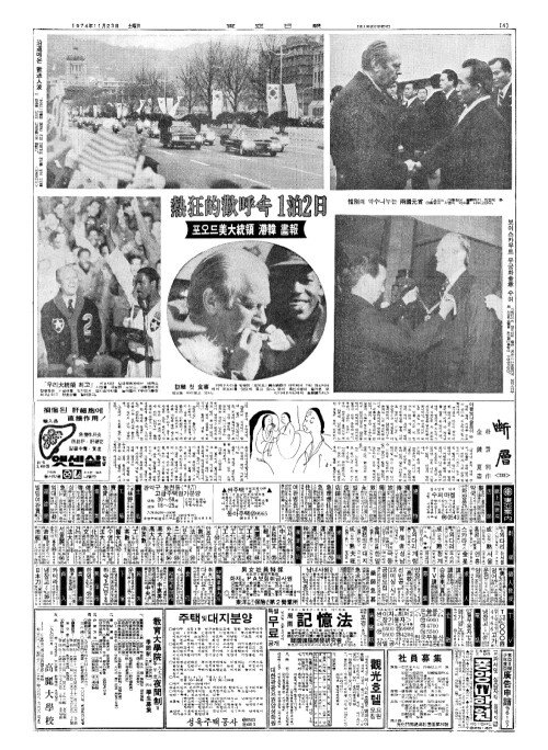 - 1日(일)백악관이된 朝鮮(조선)호텔 포오드·키신저엔 專用昇降機(전용승항기)…屋上(옥상)엔 엔진켠 헬機(기) 待機(대기) 屋外(옥외)푸울 포오드 이름따命名(명명)…記者(기자)들 通信料(통신요)4百(백)여萬(만)원