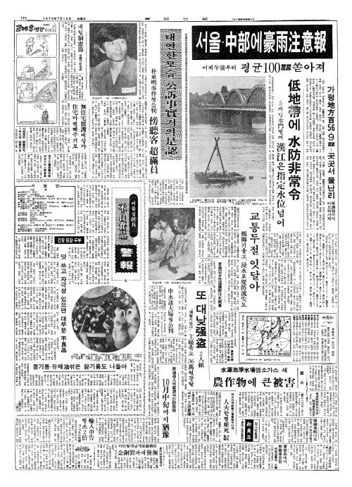 - 교통두절잇달아 橋脚(교각)기울고、浸水(침수)로堤防流失(제방류실)도