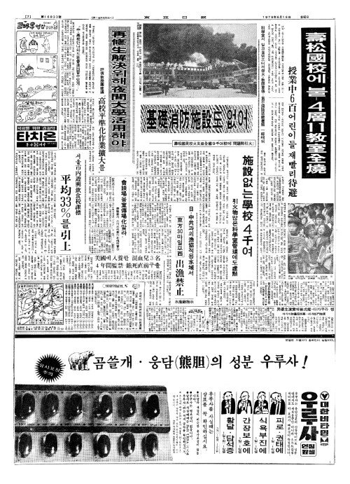 - 壽松國民校火災(수송국민교화재)로全國(전국)9千(천)여校(교)에「問題點引火(문제점인화)」 基礎消防施設(기초소방시설)도 없어