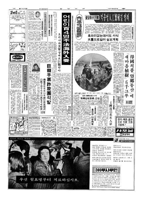 - 在日僑胞(재일교포) 奉仕團員(봉사단원) 母國(모국)의품「望鄕(망향)동산」에「새마음植樹(식수)」6千(천)그루