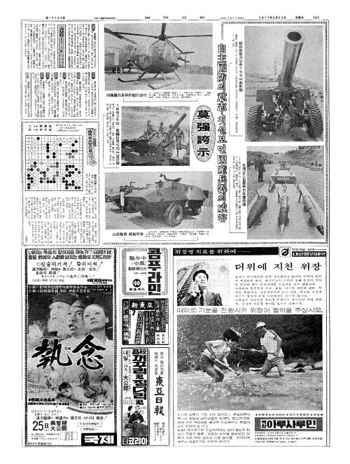 - 國産武器威力(국산무기위력)첫公開(공개)…陸軍步兵大隊攻擊(륙군보병대대공격)및火器威力示範(화기위력시범) —朴大統領(박대통영)·三府要人(삼부요인)·外交使節(외교사절)·各界人士(각계인사)2千(천)여名參觀(명삼관)